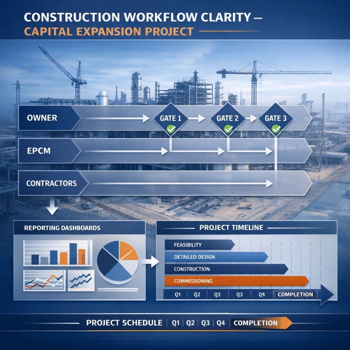 A capital construction project was experiencing delays, unclear roles, and inconsistent reporting. VALEN delivered a workflow clarity sprint that aligned stakeholders, clarified decision pathways, and restored schedule confidence.