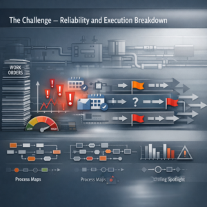 A major industrial operation was struggling with rising backlog, inconsistent workflow execution, and misalignment across maintenance, operations, and planning. VALEN delivered a rapid diagnostic, clarified systemic constraints, and built a structured action plan that reduced backlog, improved reliability, and restored operational confidence.