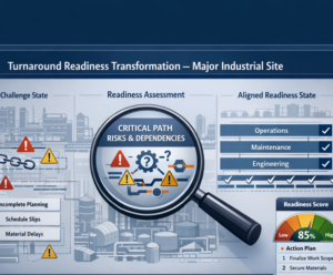 A large industrial facility faced escalating turnaround risks due to unclear readiness criteria, fragmented planning, and inconsistent cross‑functional alignment. VALEN delivered a structured readiness assessment, clarified critical path risks, and aligned leadership around a disciplined execution plan.